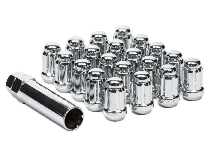 Perfect for installing custom wheels, these chrome plated lug nuts feature a small head diameter to allow for installation on wheels requiring a splined or tuner style lug nut. These feature an external spline drive and are supplied with their own key / socket for installation. They are sold in a complete 5-lug set of 20 lug nuts and 1 spline drive socket.